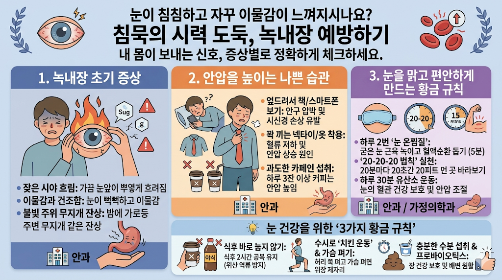 - [주의]: 이런 증상이 나타날 정도라면 이미 녹내장이 진행 중일 수 있으니, 지금 당장 안과에서 안압과 시신경 검사를 받아보셔야 합니다!