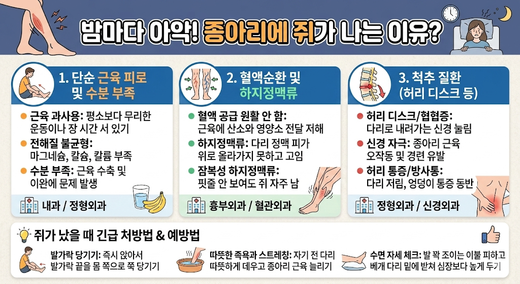 - 왜 생기나요?: 혈액순환이 잘 안 되면 근육에 산소가 제대로 전달되지 않아요. 특히 '하지정맥류'가 있으면 다리 정맥의 피가 위로 올라가지 못하고 고이면서 근육을 자극해 밤마다 쥐를 유발하게 됩니다.