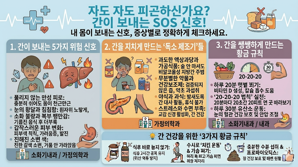 오늘은 내 간이 지금 얼마나 지쳐 있는지 알아보는 법부터, 독소 가득한 간을 깨끗하게 청소하고 아침마다 개운하게 일어나는 비결까지 아주 자세하고 친절하게 이야기를 나눠볼게요. 지금 바로 기지개를 한 번 크게 켜면서 시작해 볼까요?