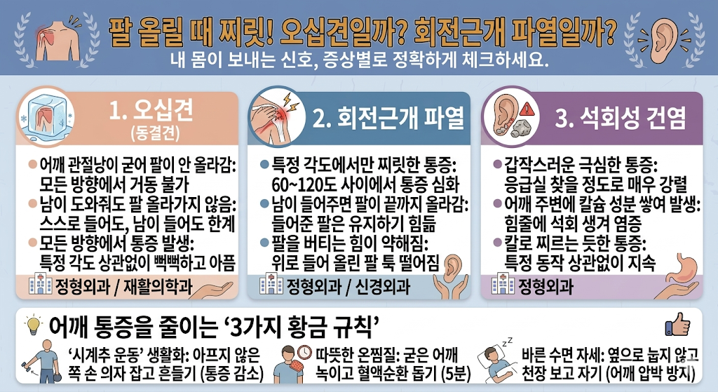 오늘은 어깨 통증의 양대 산맥인 '오십견'과 '회전근개 파열'을 어떻게 구분하는지, 그리고 내 소중한 어깨를 부드럽게 되살리는 비결은 무엇인지 아주 자세히 파헤쳐 볼게요. 오늘 글 읽으시면서 내 팔은 어디까지 올라가는지 한 번씩 체크해 보세요!